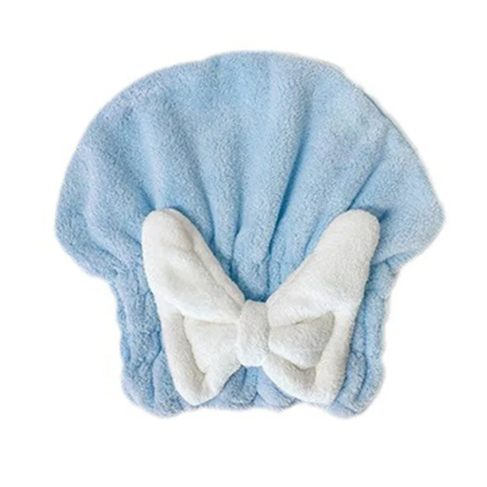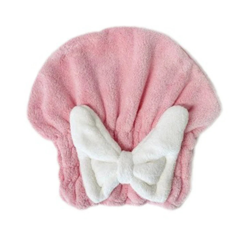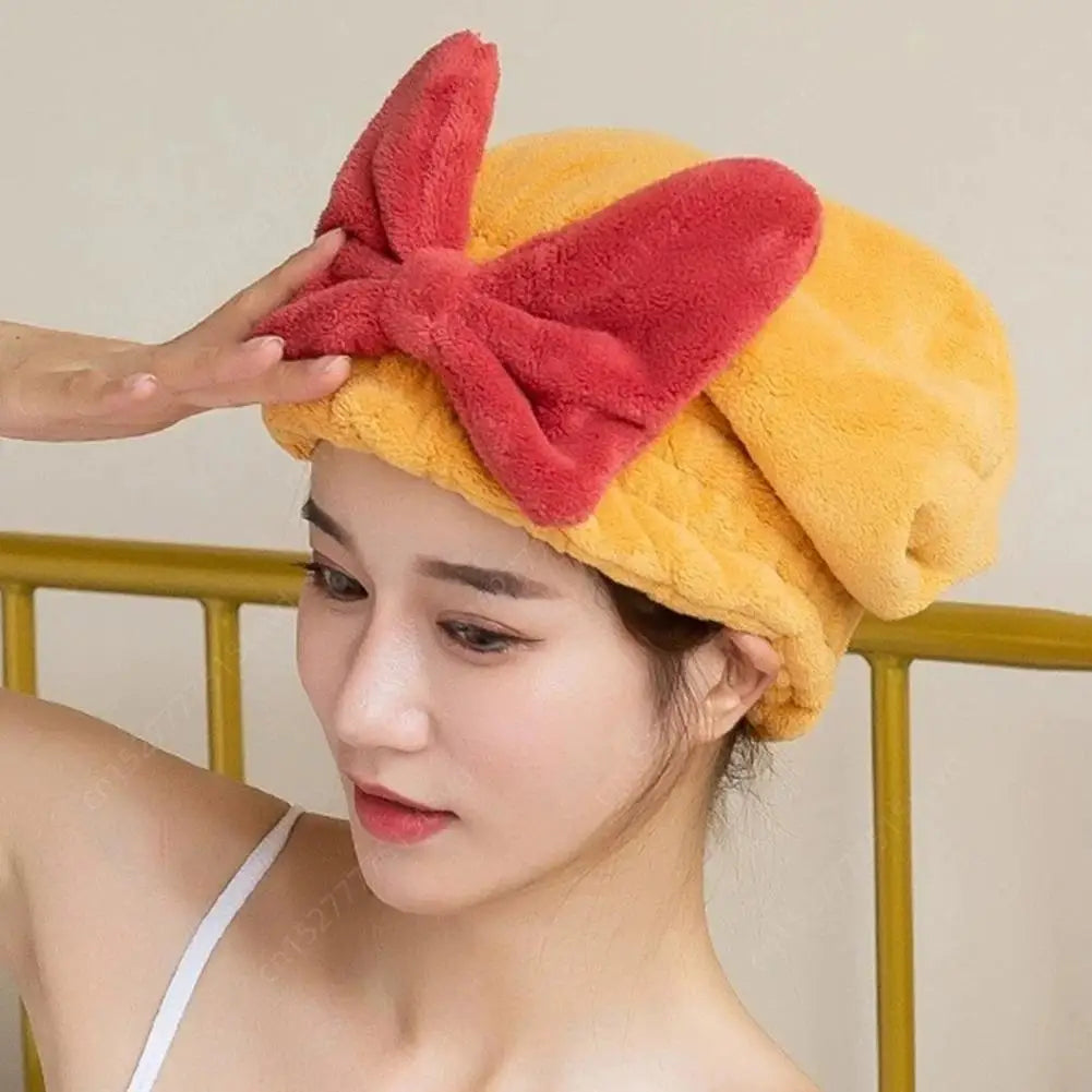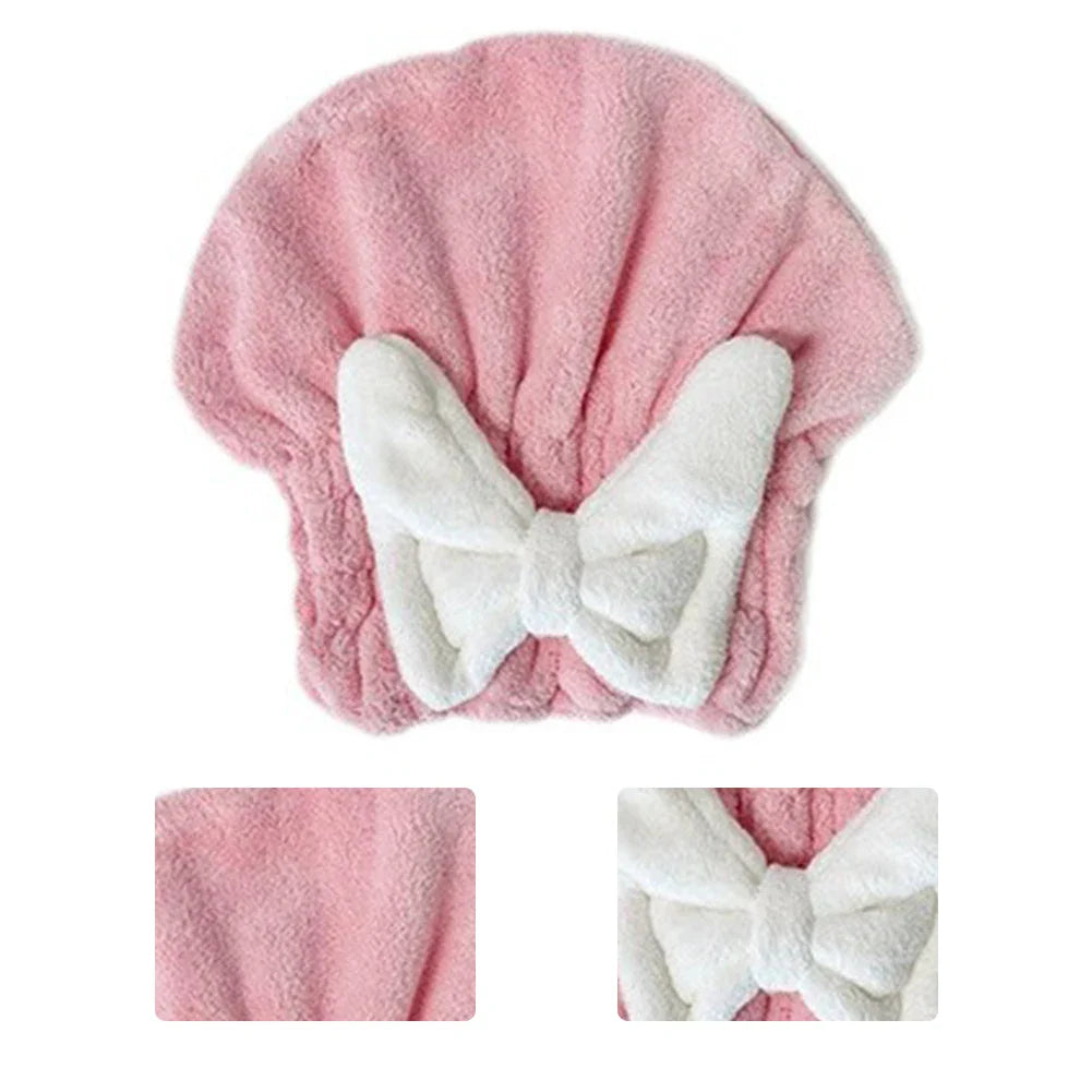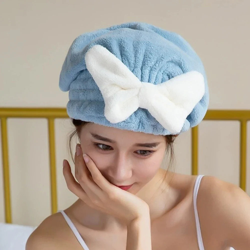 Frau trägt das HairHug Mikrofaser Haartrocknungshandtuch mit großer Schleife – schnelltrocknend, schonend und rutschfest für sanftes Haartrocknen ohne Hitze.