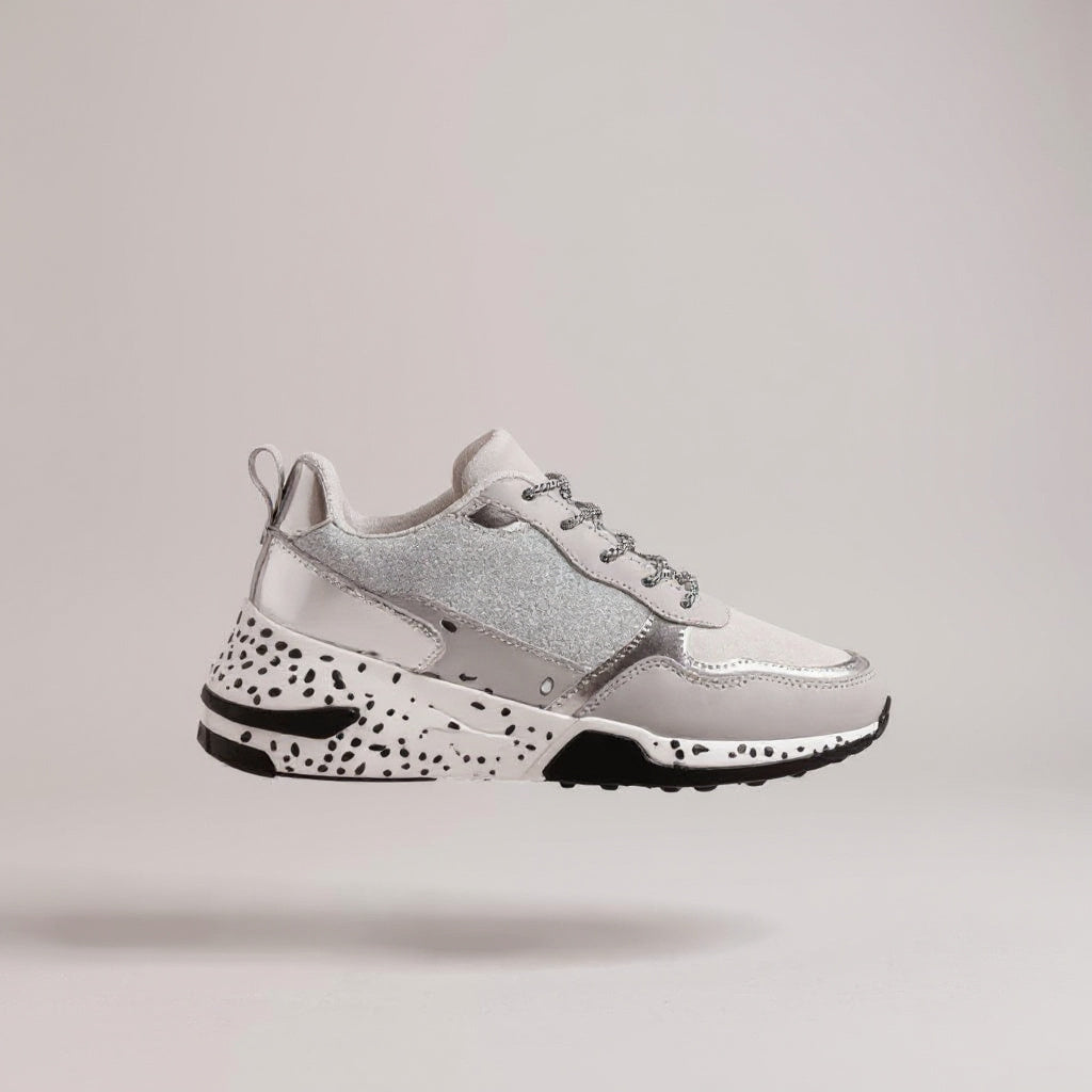 Damen Sneaker silber mit Glitzer-Details und weißer Sohle im Dalmatiner-Design, trendige Sportschuhe für Freizeit und Alltag